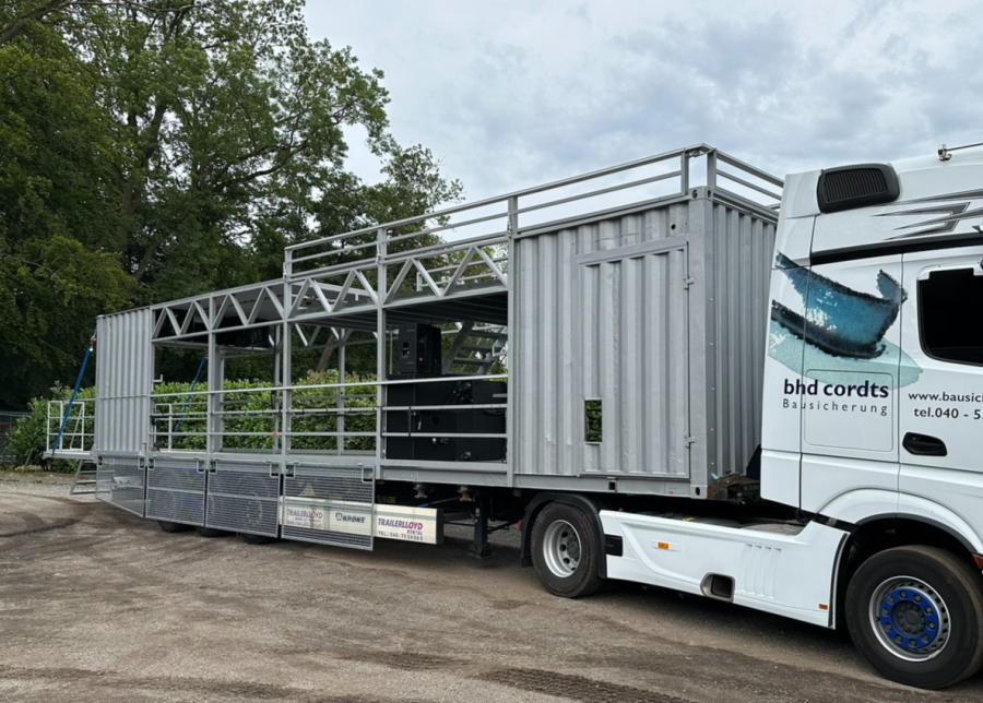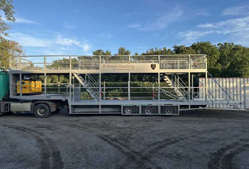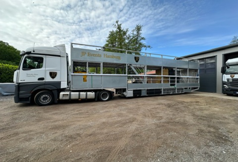 Der Megaliner ist unser größtes Fahrzeug. Der Plattformanbau erweitert die Nutzfläche und schafft zusätzlichen Platz. Der Truck hat einen Aluriffelblechboden für eine rutschsichere und glitzernde Fläche. Auch der Megaliner bietet 2 Treppen für die Sicherheit.